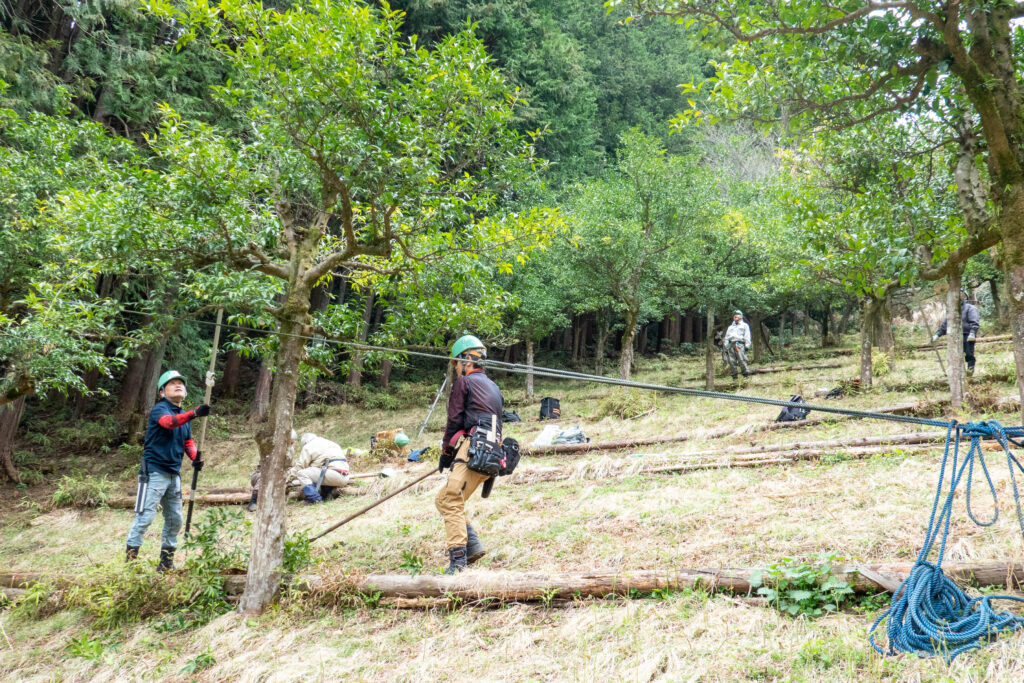 枝を払って玉切りして、ゆず畑を挟んで反対側の茶畑まで丸太を運搬しました。