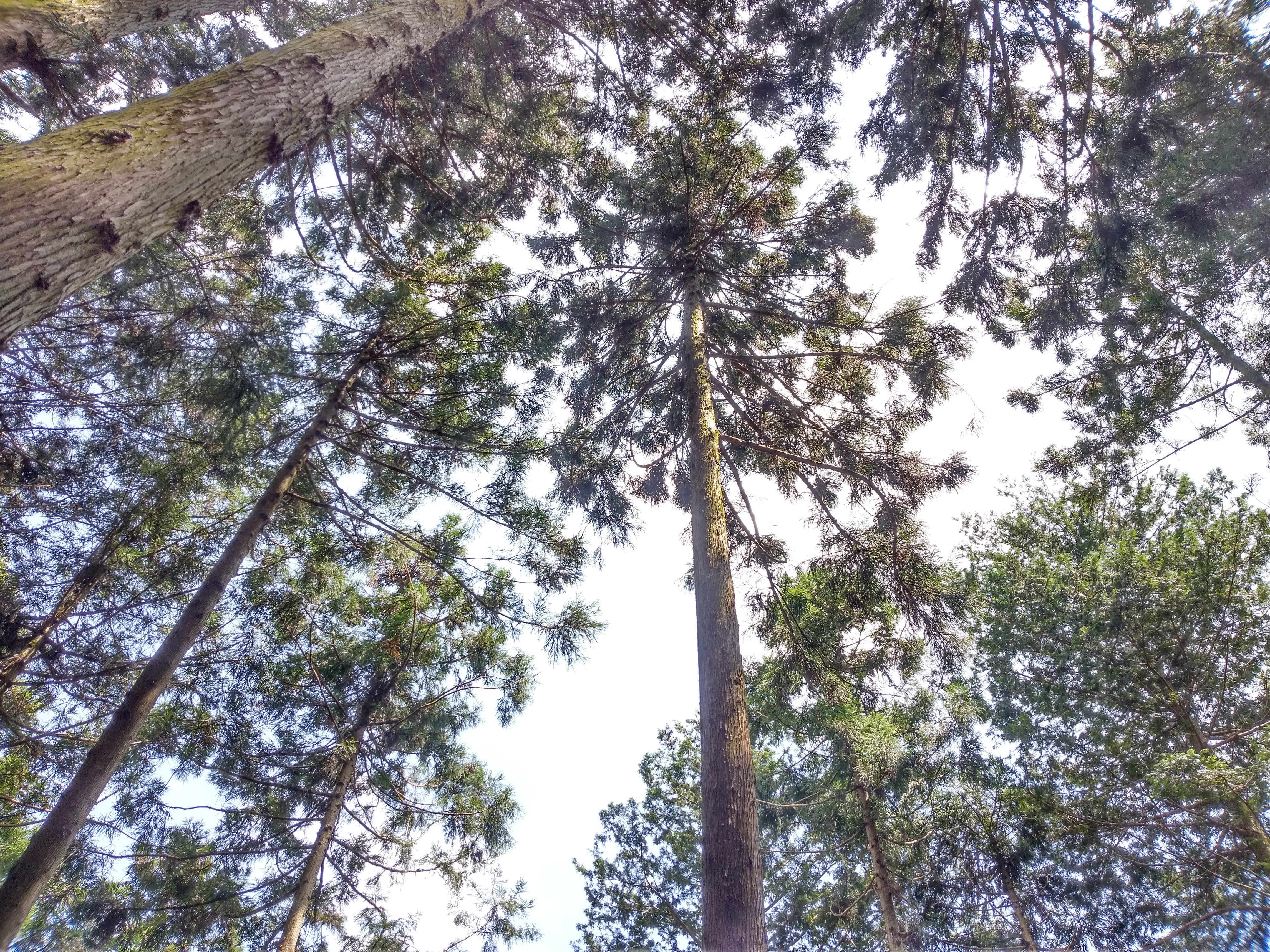 ターゲットはこの木。見上げると青空が隠れています。この木の枝がなくなると空が見えてきますね。日光が地面に届くということです。