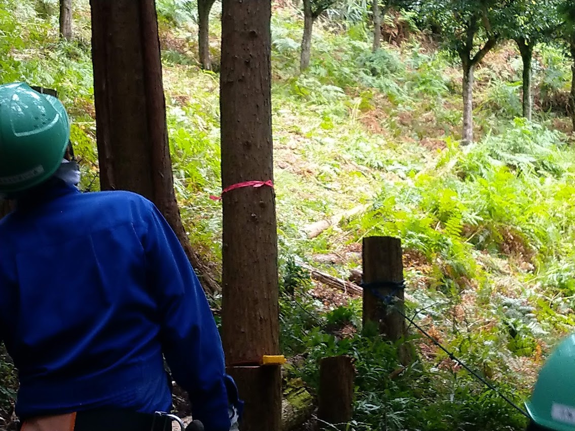 まずは間伐。密集した木を間引いて地面に光を入れるためですが、倒した木を柚子畑の階段の材料にするという目的もあります。
