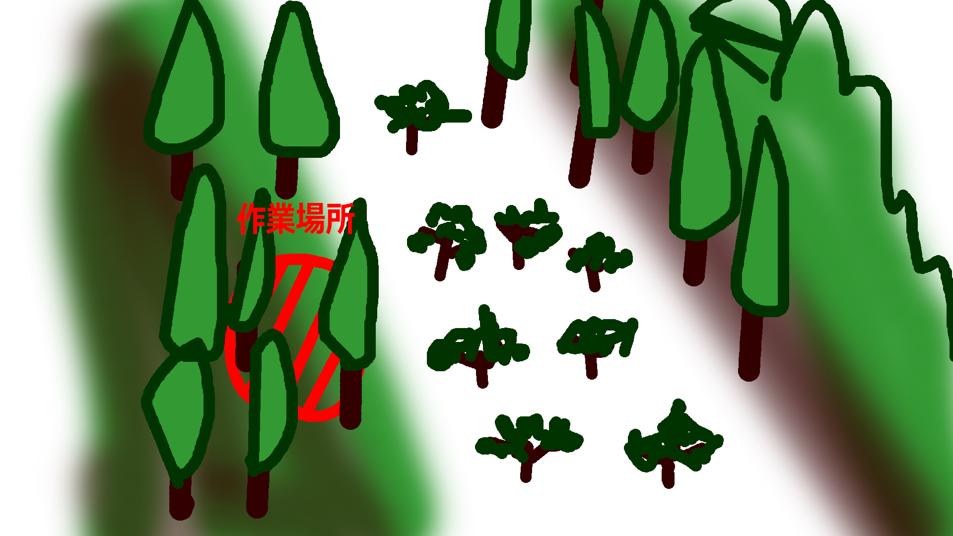 木を倒すときは斜面に対して横になるようにするのが基本です。縦にしてしまうと、倒れた瞬間にはねて思わぬ方向に飛んで行ってしまったりと、危険なんです。