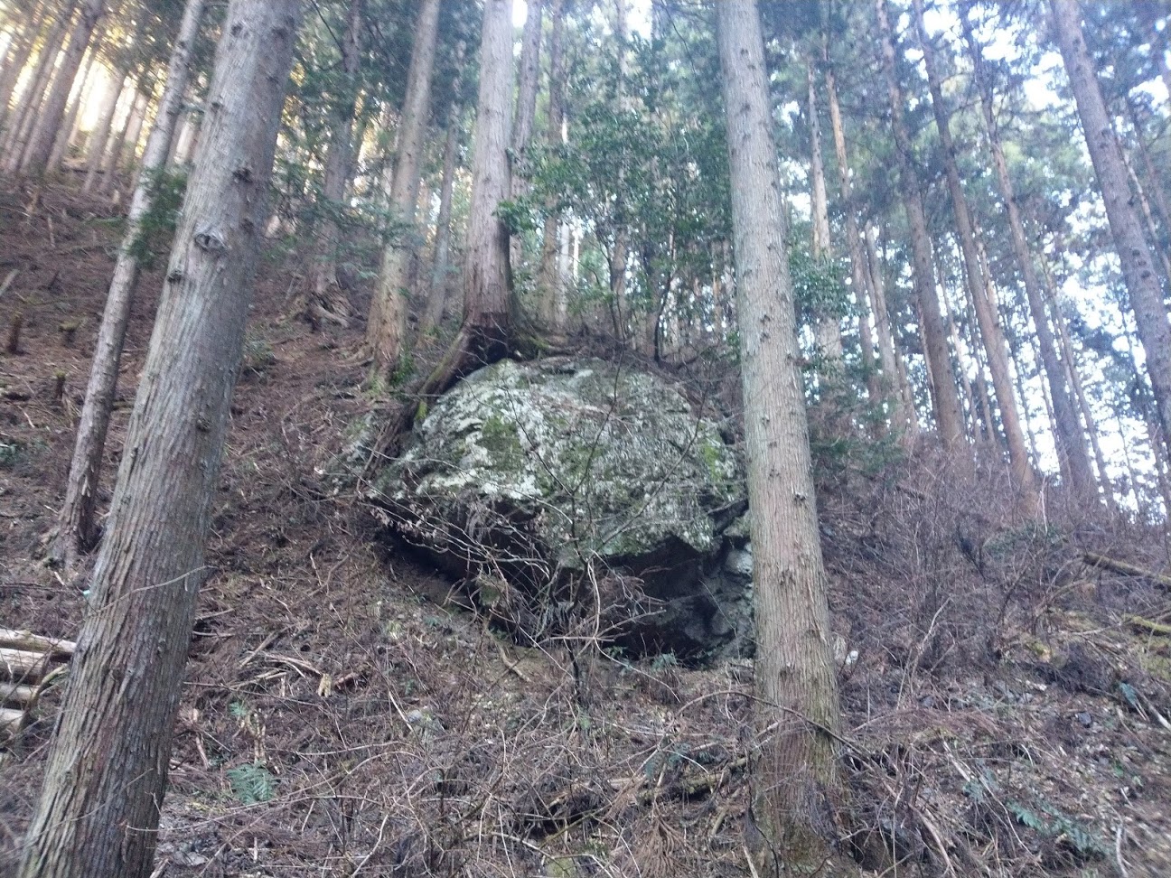 そして...開けました! 目の前はゆず畑。足元には丸太がゴロゴロ。帰りにこれを持って下山します。