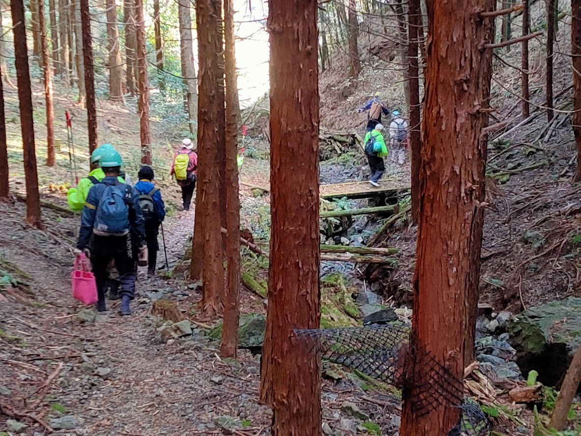柚子畑はずっと上の方です。途中、数か所道が崩れていますので、班ごとに隊列を離れては道を補修していきます。