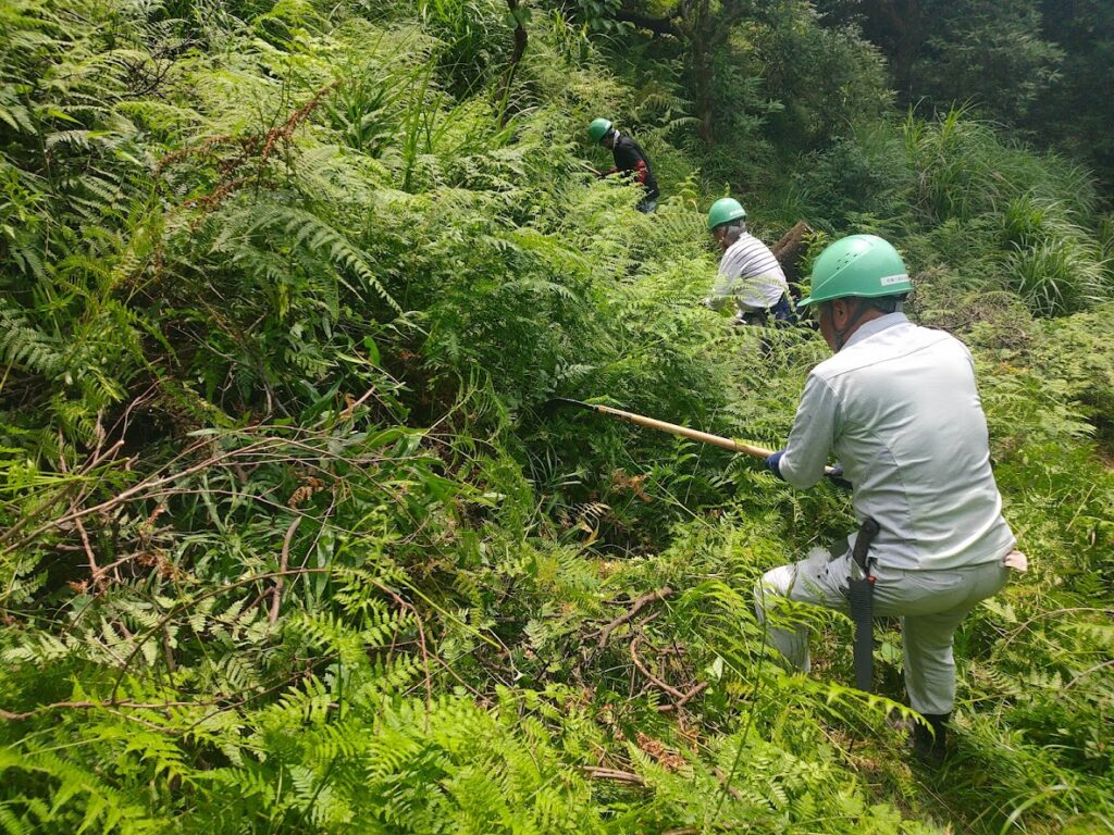 第7回定例活動は、ゆず園の下刈りと茶畑に入るための階段づくりです。