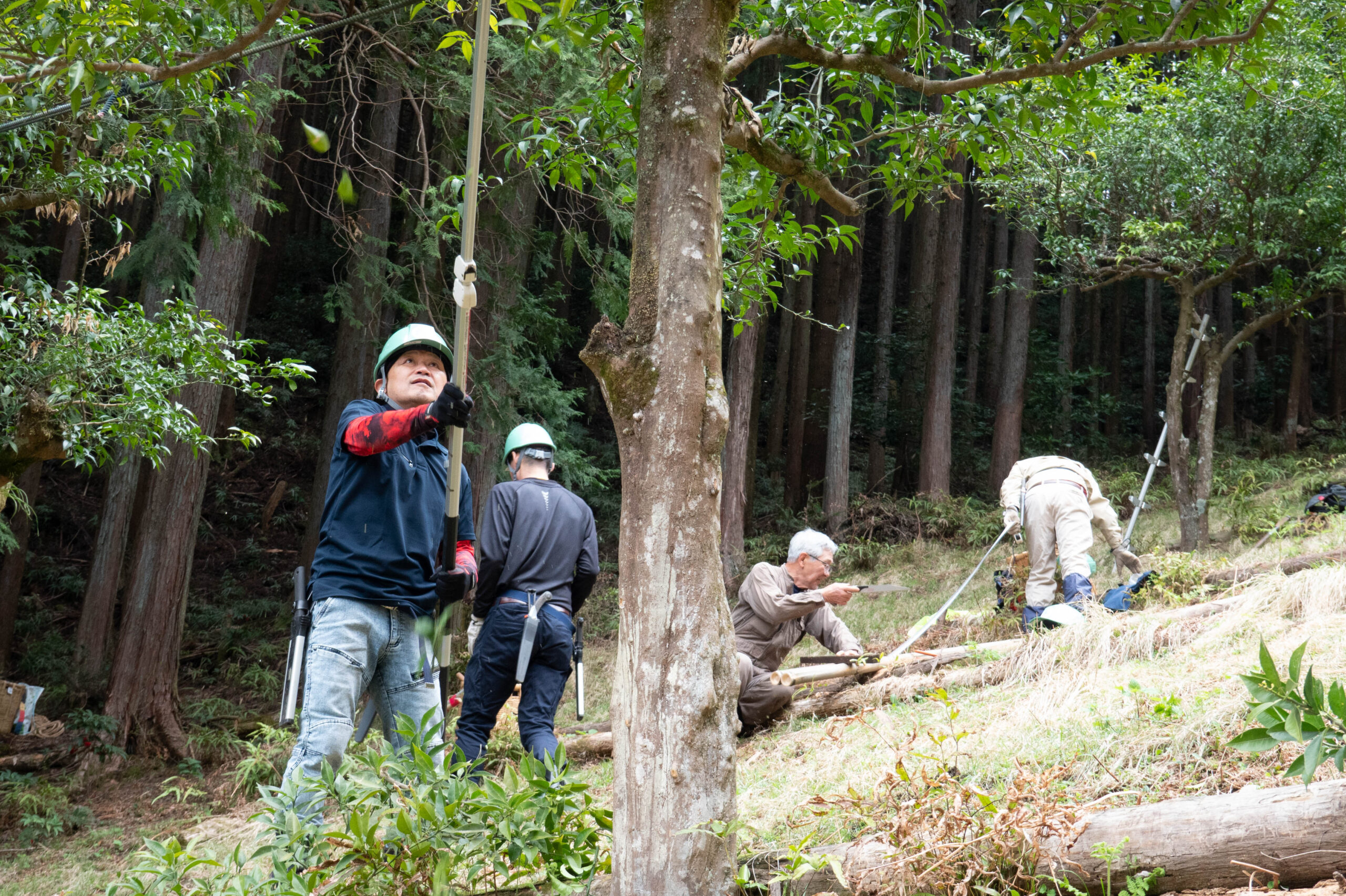 枝を払って玉切りして、ゆず畑を挟んで反対側の茶畑まで丸太を運搬しました。