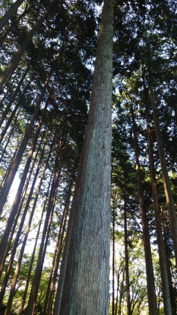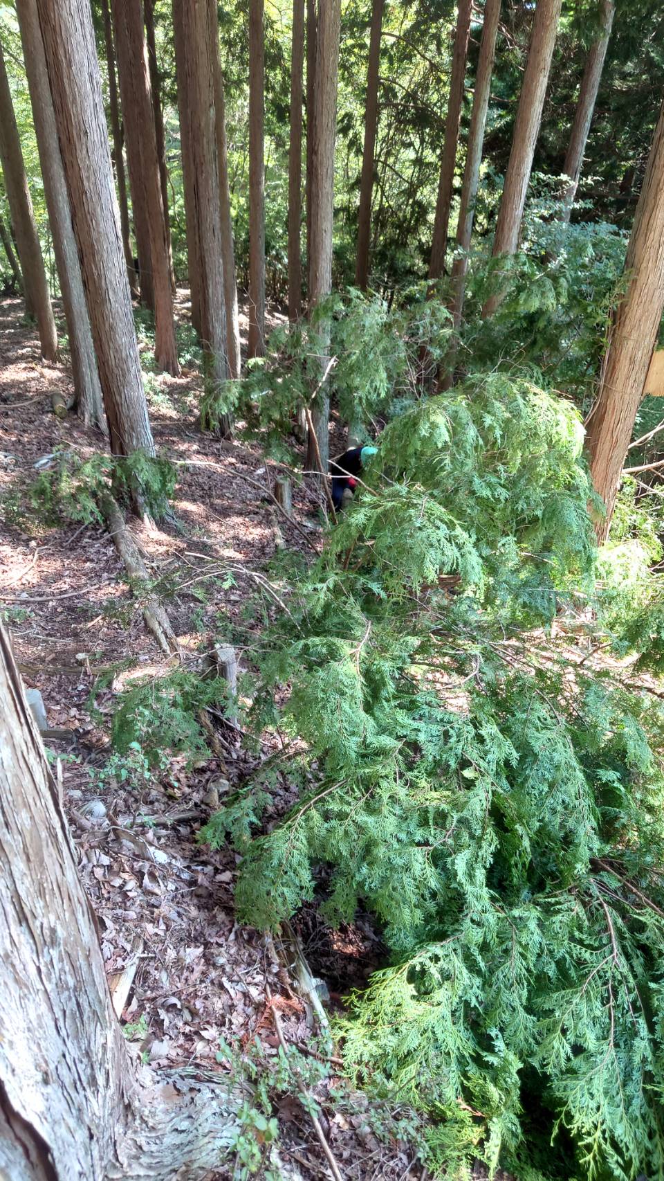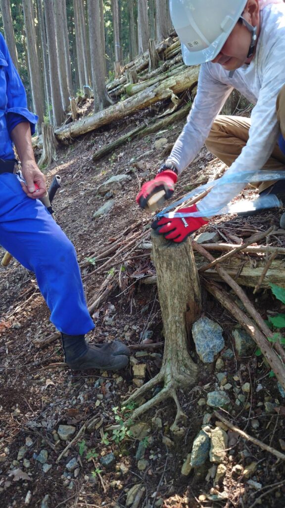 掛かり木前提の伐倒でしたが、早めの判断が功を奏して10分弱で伐倒完了。きれいに皮を剥き、枝も長さをそろえてまとめました。今後の開発の材料になります。