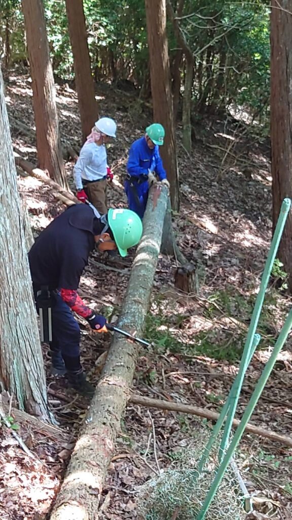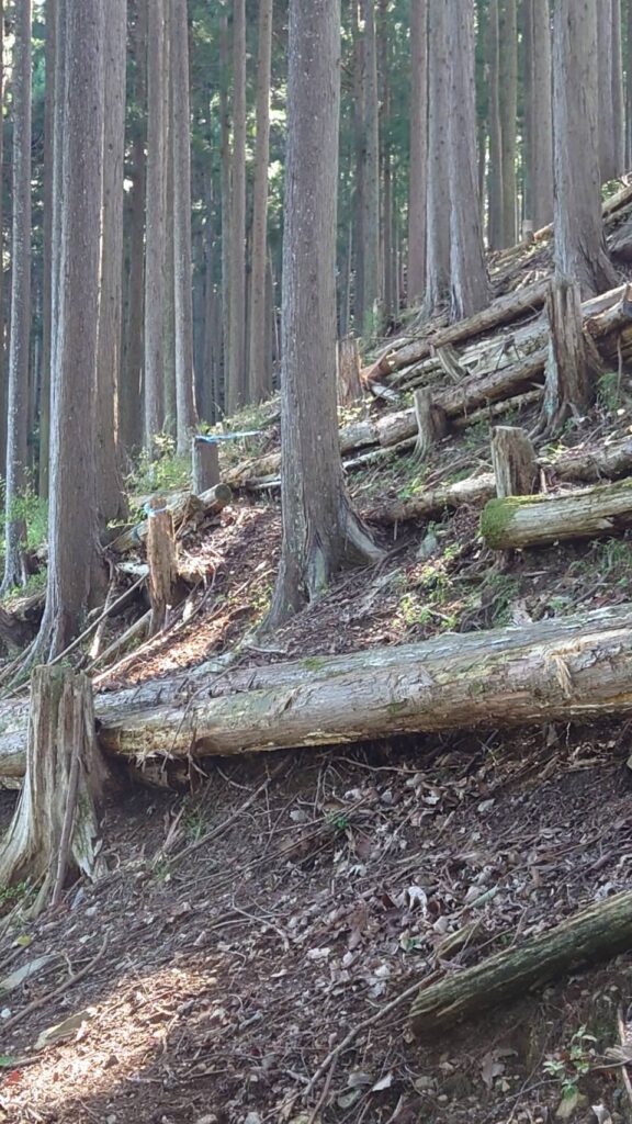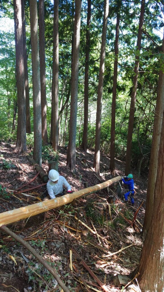 伐倒木は6m・5m・4m・に玉切り、皮を剥いて次回の作業道の補修用に準備しました。