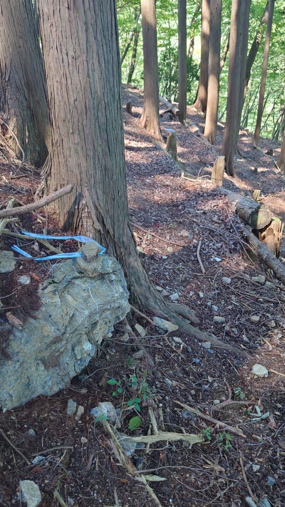 展望台までのルート決定。なるべく平らなところを歩いて、いくつか階段があって、というルートを考えました。目印を付けました。作業を進めながら柔軟に考えていきましょう。