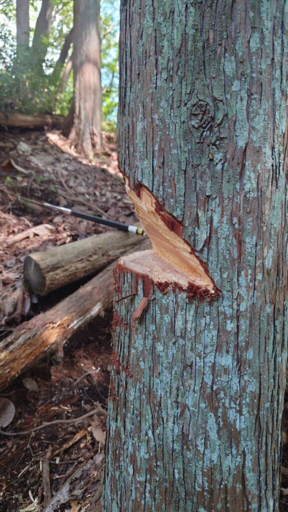 前回の反省点を生かし、支点の変更を早期に判断して掛かり木から10分弱で伐倒しました。